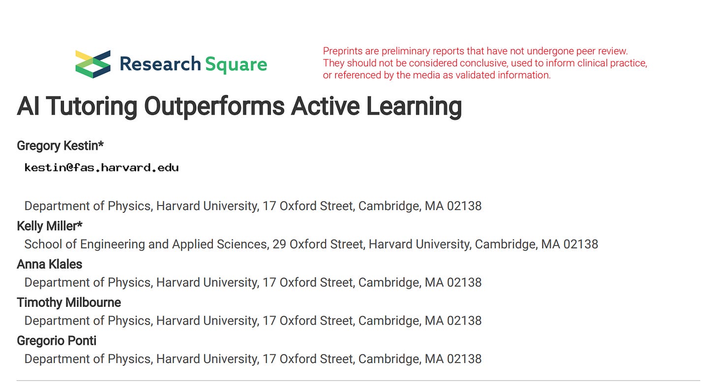 Kestin, Gregory, et al. “AI Tutoring Outperforms Active Learning.” Research Square (Research Square), Research Square (United States), May 2024, https://doi.org/10.21203/rs.3.rs-4243877/v1. Accessed 30 Jan. 2025.